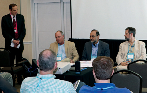 Mark Michelson of Napco Media, left, and Copresco’s Steve Johnson, right, participate in a panel dialog at the Inkjet Summit.