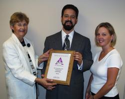 Copresco president Steve Johnson presents an APEX 2001 Award of Excellence for website content to (l. to r.) Georgiana Kipp, executive director of the Plumbing and Mechanical Contractors Association of Northern Illinois, and Tracy Kampert, executive assistant. |