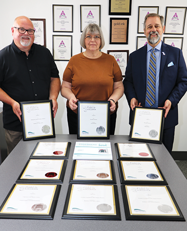 GLGA Chairman Joe Lyman helps Production Manager Lynn Buck and President Steve Johnson show off the dozen awards most recently won by Copresco for quality and print excellence.